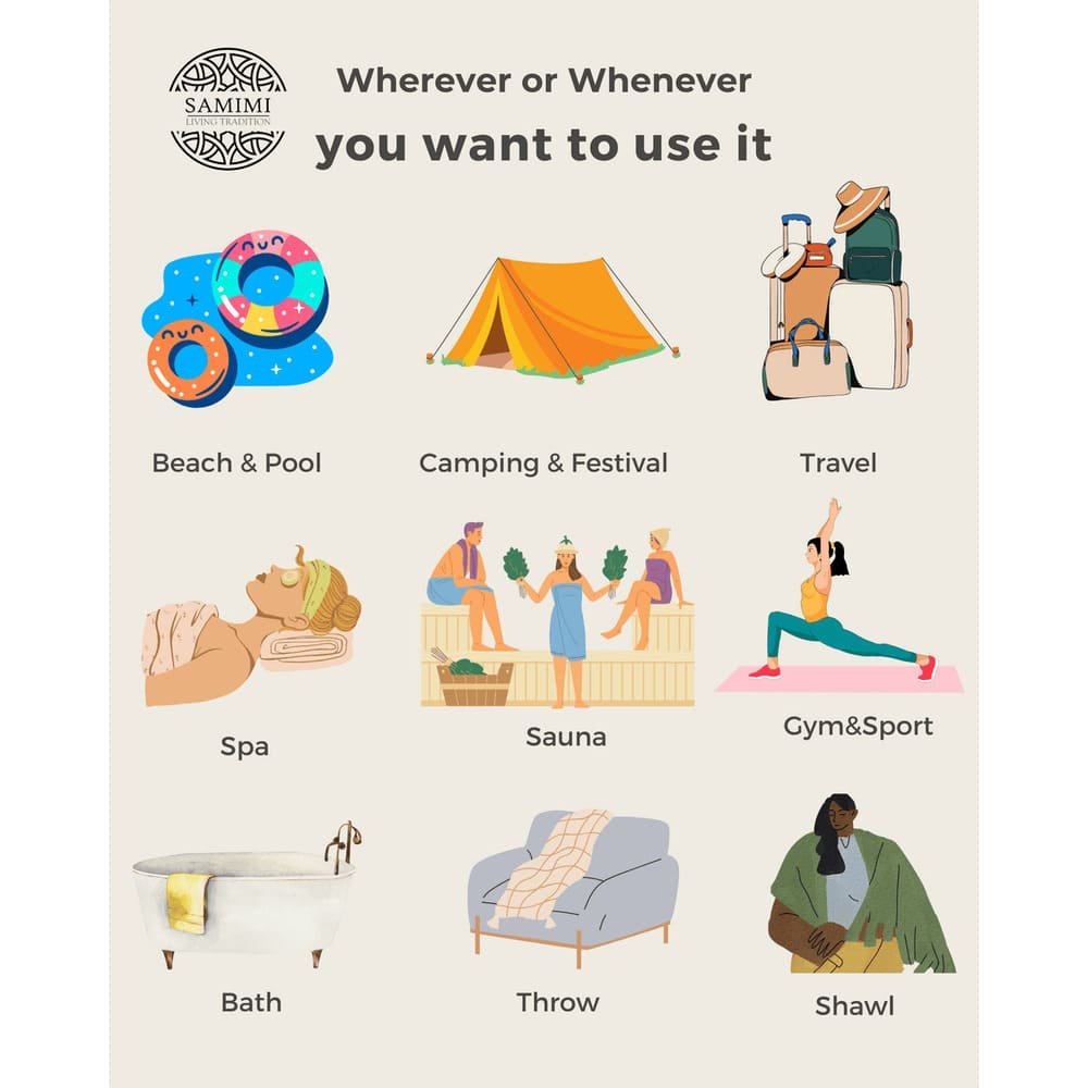 Universalus panaudojimas – galima naudoti kaip rankšluostį, skarą, šaliką, pledą ar interjero detalę.