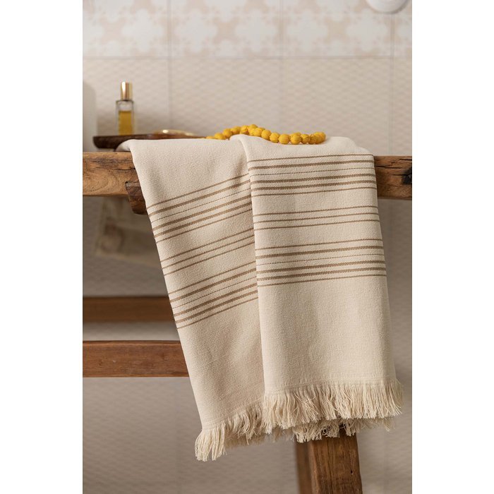 Smėlio spalvos „Cancun“ hamam tipo paplūdimio rankšluostis (90×180 cm) – lengvas, greitai džiūstantis, pagamintas iš 100 % medvilnės, su frotiniu paviršiumi ir tradiciniais kutais. Puikus pasirinkimas tiek kelionėms, tiek kasdieniam komfortui.