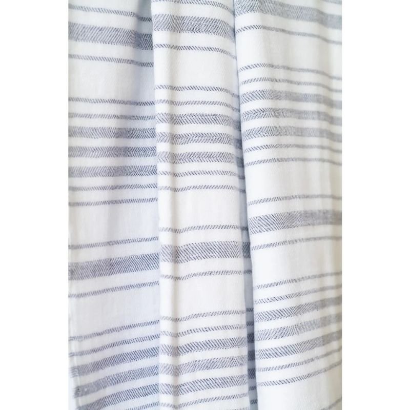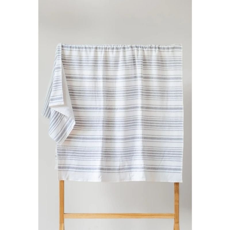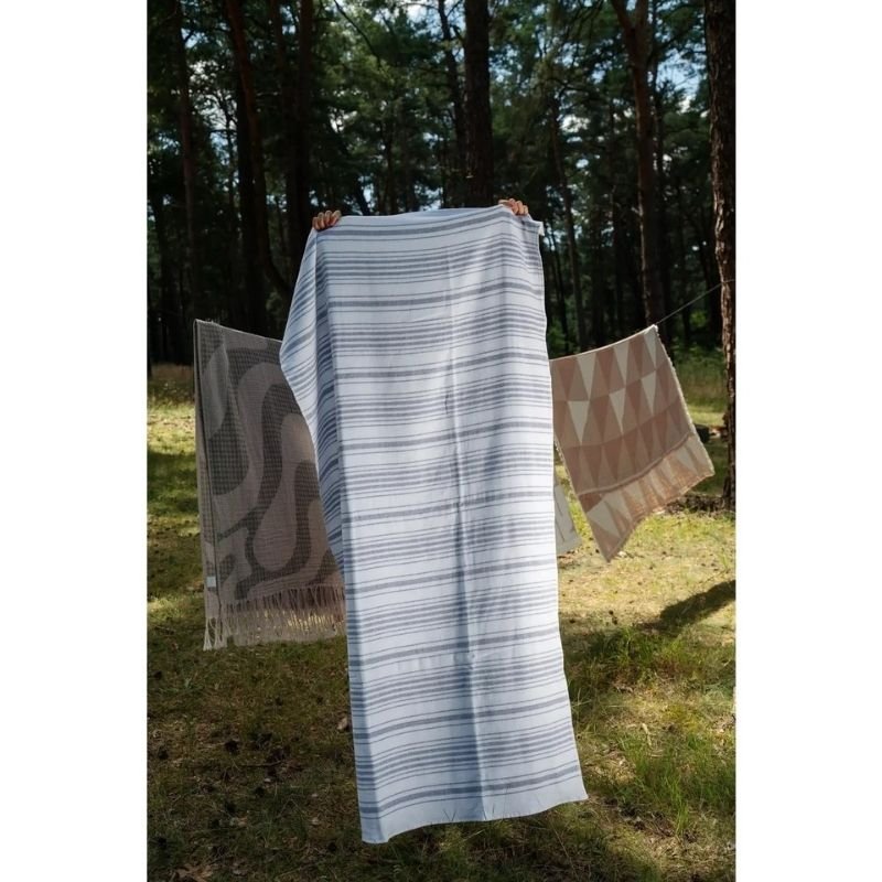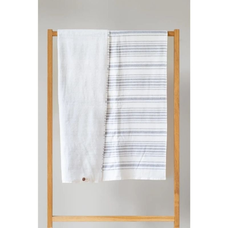 Dviejų pusių medvilninis rankšluostis „Marine“ – 100 × 180 cm arba 50 × 90 cm. Viena pusė – švelni, lygi medvilnė, kita – frotinė. Be chemikalų, iš deadstock (likutinio audinio), 100 % turkiška medvilnė.