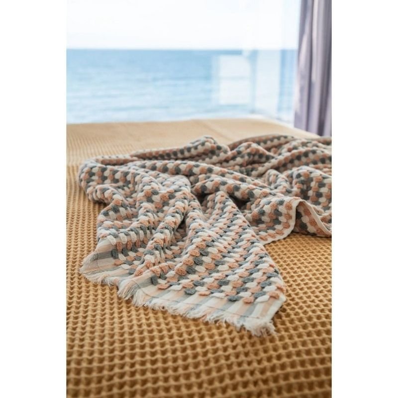 Vonios rankšluostis „Popcorn“ – 76 × 142 cm, 100 % turkiška medvilnė, be cheminių apdorojimų. Švelnus, sugeriantis, tvarus pasirinkimas kasdieniam komfortui namuose ar kelionėje.