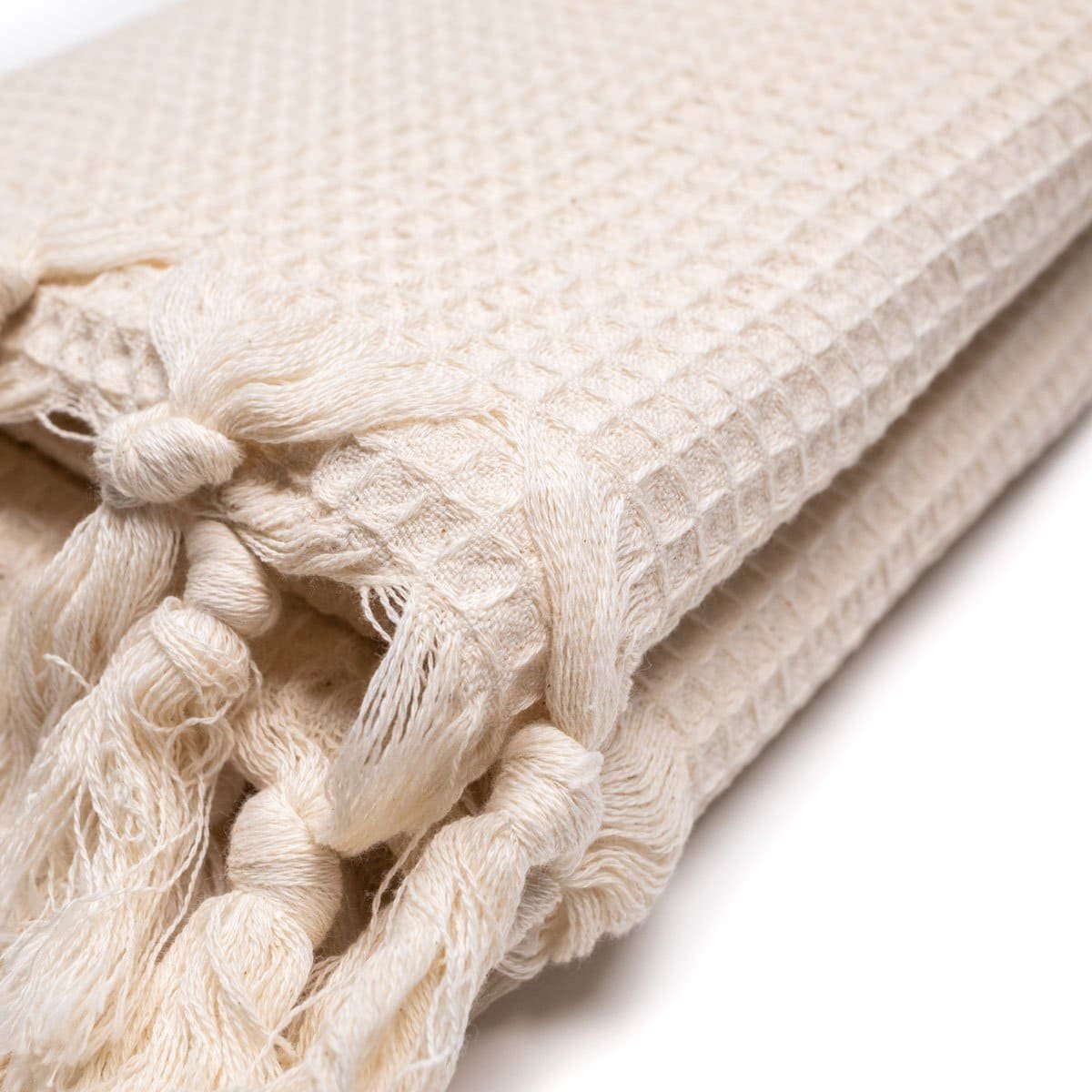 Rankų darbo baltas vaflinio audinio pestemalis „Wafflepiqué“ – švaros, lengvumo ir elegancijos simbolis